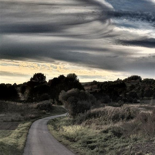 Krótki spacer w kierunku Wrzosów. Od remizy w górę, ale raz ścieżką w prawo, raz w lewo. Wieczór taki pogodny i spokojny, a chmury przyjmują kolory i kształty, że oczu oderwać nie można. Półgodzinna podróż sentymentalna - nie wycieczka, ani nawet spacer. Podróż wgłąb siebie, bajecznie kolorowa.