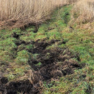 Spacer pierwszy - dość eleganckie kozaczki. Dość szybko pożałowałam takiego obuwia, ale nie spaceru. Podmokły, błotnisty teren z laskiem, przecięty Rybnianką, nad nią betonowy mostek - a widok oszałamiający. Za chwilę zaczynają się po lewej wierzby, z prawej mam ogromny podmokły ugór i oddzielający go ode mnie rów z wodą - teraz już częściowo zarośnięty. Pośrodku ścieżka, którą właśnie idę i która doprowadziła mnie do miejsca zrytego przez dziki. W końcu zrobiło mi się lekko nieprzyjemnie i zawróciłam.