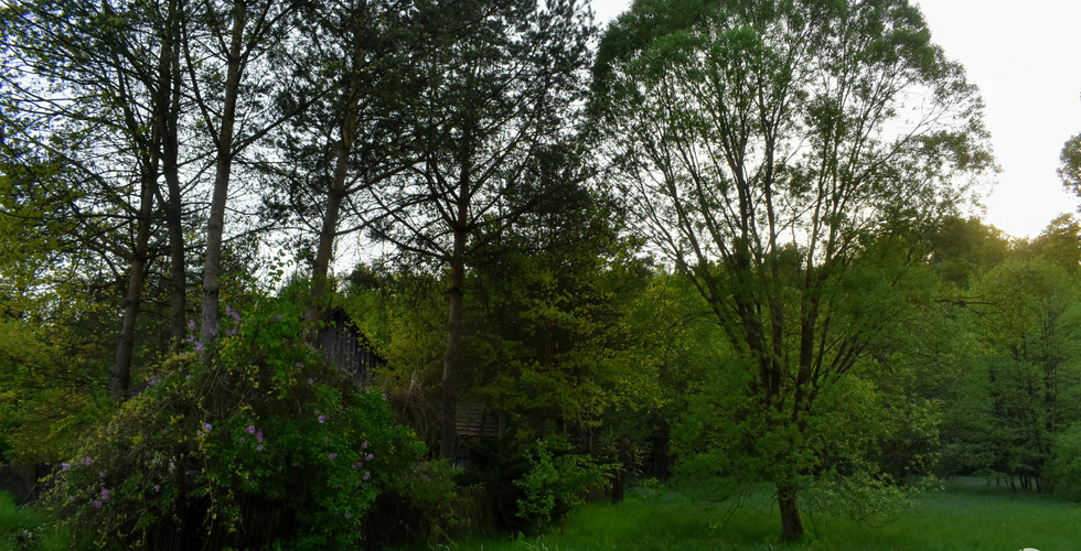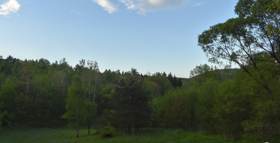 Wchodzę w las. Nadchodzi wieczór, słońce przez moment jeszcze ostro świeci, niebawem rozmyje się w lekkich chmurach. Trawy i liście są mokre od deszczu. Mam kalosze i staram się chodzić ścieżkami wydeptanymi przez zwierzęta, ale za chwilę i tak będę miała spodnie mokre po kolana. W pobliżu potok przecina pod mostkiem drogę, w tym miejscu jest wąski. Chodzę skrajnymi łąkami - powoli zmierzcha się i nie chcę zbyt daleko oddalać się od drogi. Tu nie ma spektakularnych krajobrazów, ale jest spokój i niezmącona niczym cisza. Ślady racic i kopyt. Jakieś leje, ścieżki które prowadzą nie wiadomo dokąd, miejsca gęsto porośnięte roślinnością niczym dżungla lub przejrzyste łąki. A dalej w górę będzie pole a przy nim kapliczka, na horyzoncie zaś widoczne kopuły wież klasztornych w Alwerni. Jeszcze kawałek i wiem, że skręcając w prawo doszłabym do skał i iglic.