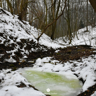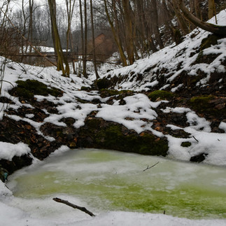 Schodzę do Rybnianki i już się zastanawiam jak szeroko popłynie woda wiosną. Teraz idzie się dobrze. Szkoda tylko, że śnieg przykrywa ziemię i skały i z rzadka można się im przyglądać. Dominują dwa kolory - biały i brązowo-czarny. Woda spokojnie obmywa kamienie. Idę pod prąd. W końcu napotykam coś co przyciąga niepodzielnie uwagę - zielone oczko wodne - wypełnione zagłębienie, które nie zdążyło stopnieć ani stracić na urodzie, nie przybrało jeszcze postaci przejrzystej tafli. Nie mam odwagi sprawdzić, na ile skuł je lód i jak jest głębokie. Wyobraźnia pracuje. Kiedy jednak za wodociągami koryto wypłaszcza się i rozszerza usłane po brzegi puchem, nie zastanawiam się długo i wskakuję. Tu woda schowała się pod kamieniami i krąży wokół skał. Nie idę tak jednak zbyt długo. Bezpieczny spacer kończy się, na wprost mam ogromne głazy a w prawo wąski jar. A wyobraźnia pracuje. To ja zaczekam jednak aż stopnieje śnieg.