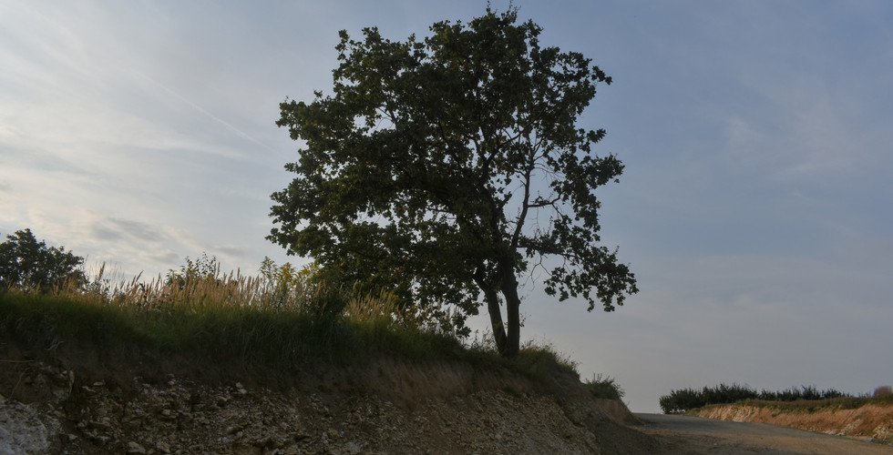 Pojechałam dalej, zostawiając za sobą po prawej stronie Strug. Wysiadłam z auta i dopiero teraz naprawdę poczułam się dziwnie. Wiedziałam bez wątpienia gdzie jestem a mimo to nie rozpoznawałam miejsca. Nowobudowana droga przerwała pole, łąkę i sad. Na skarpie, na krawędzi stał dąb. Trochę się pogubiłam, dopiero po dłuższej chwili zrozumiałam, że "stara" droga, dróżka idzie obok.
