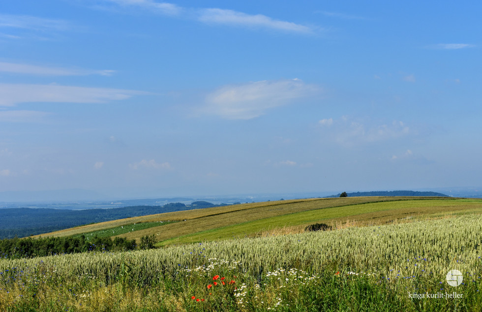 369,2 m npm. Kiedy nie było jeszcze punktu ujęcia wody - panorama doskonała. Pani Maria z mężem Mieczysławem, którzy ją tu postawili by móc patrzeć na te cuda krajobrazowe bardzo lubili tu przychodzić. Szybko się okazało, że nie tylko oni - miejsce stało się bardzo popularne, jest pewnym wyznacznikiem na mapie Rybnej.